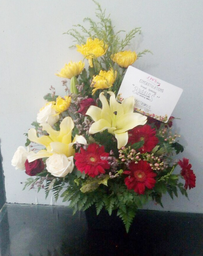 Standing Flower Makassar Krisan Kuning, Aster Putih, aster cokelat dan mawar merah