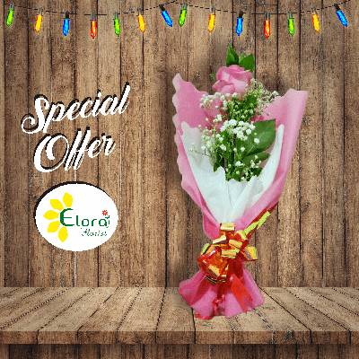 Hand Bouquet dengan 1 tangkai bunga mawar pink, baby breath dan daun ruskus