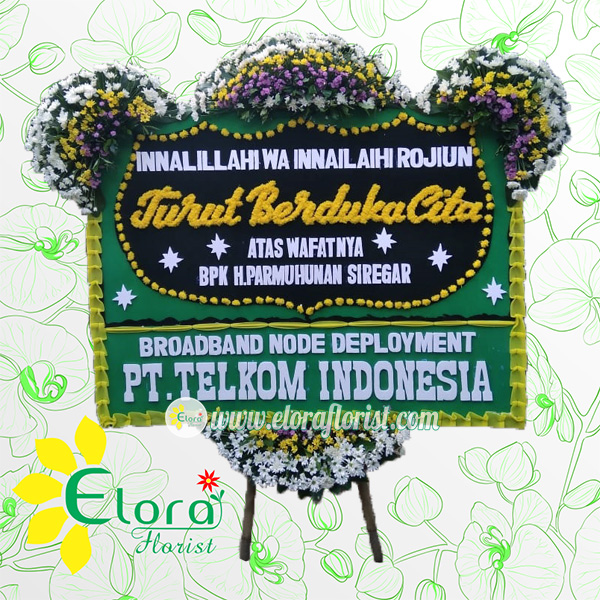 Bunga papan duka cita nuansa islami / muslim dengan tulisan “INNALILLAHI WA INNAILAIHI ROJIUN” ukuran 1,5m x 2m dengan 3 jambul bunga