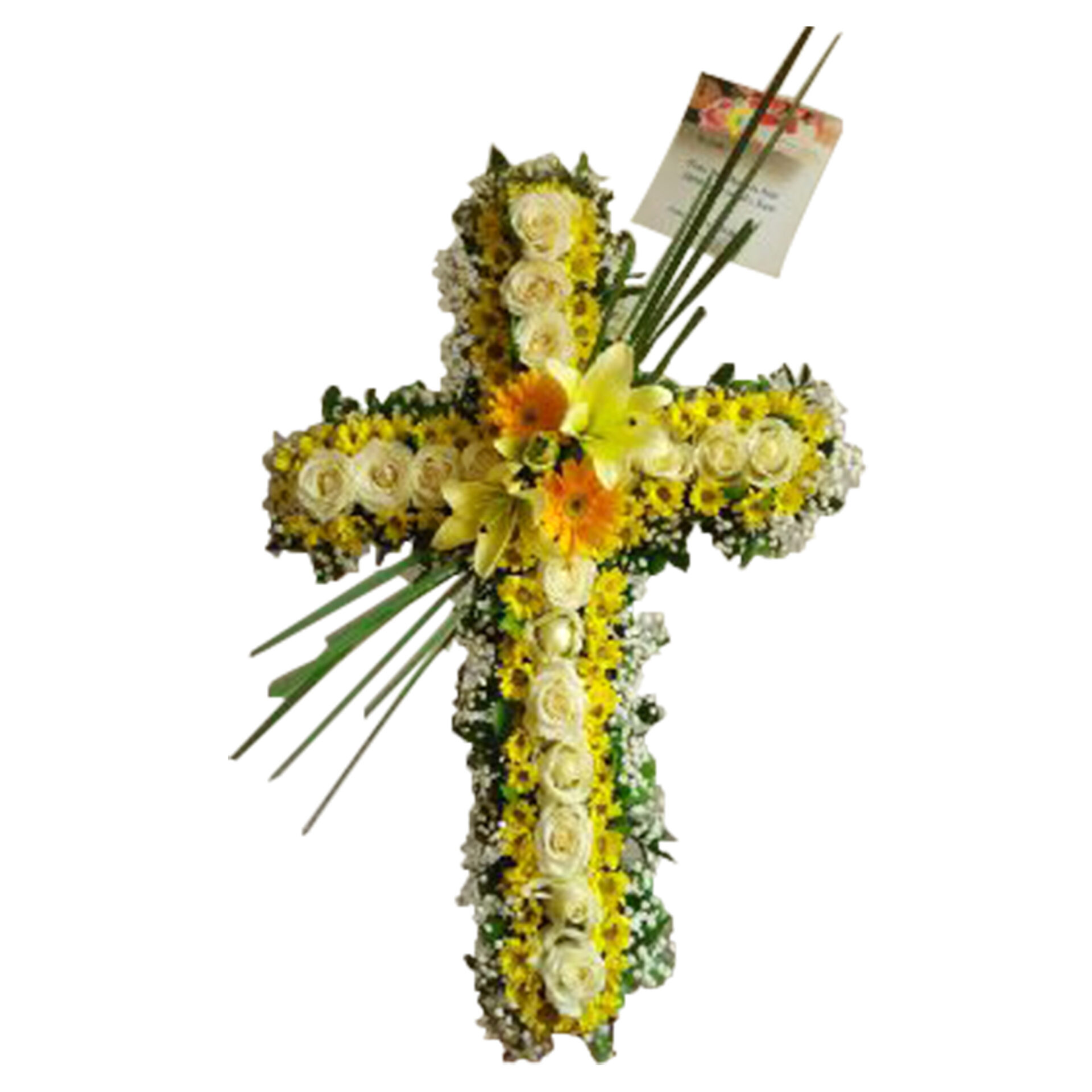 bunga salib menggunakan bunga krisan putih, aster kuning, mawar putih casablanca mengunakan standing kaki