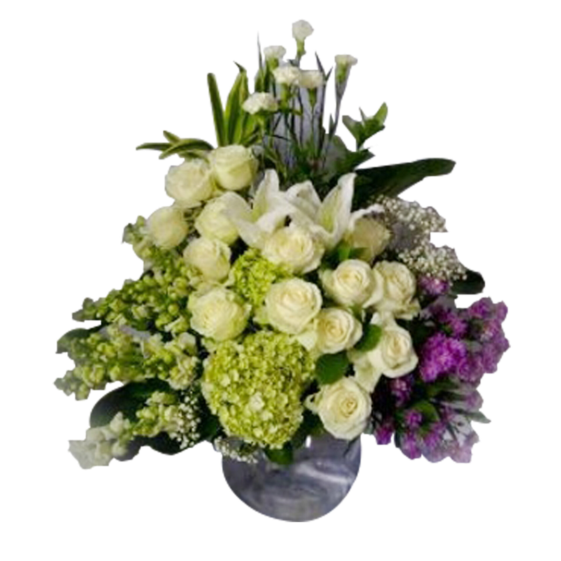 Bunga Meja Mawar Putih-Casablanca-Hortensia Hijau-Snap Dragon-Carnetion-Pikok Ungu